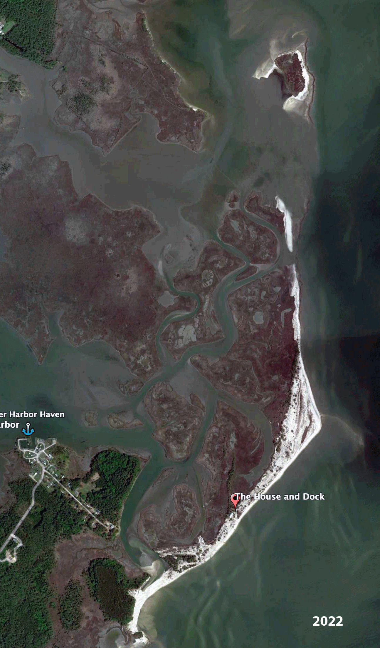 You can see the dramatic change in recent satellite images. Here is the whole island shot ten years ago, with the north and south inlets still deep and navigable by large boats.