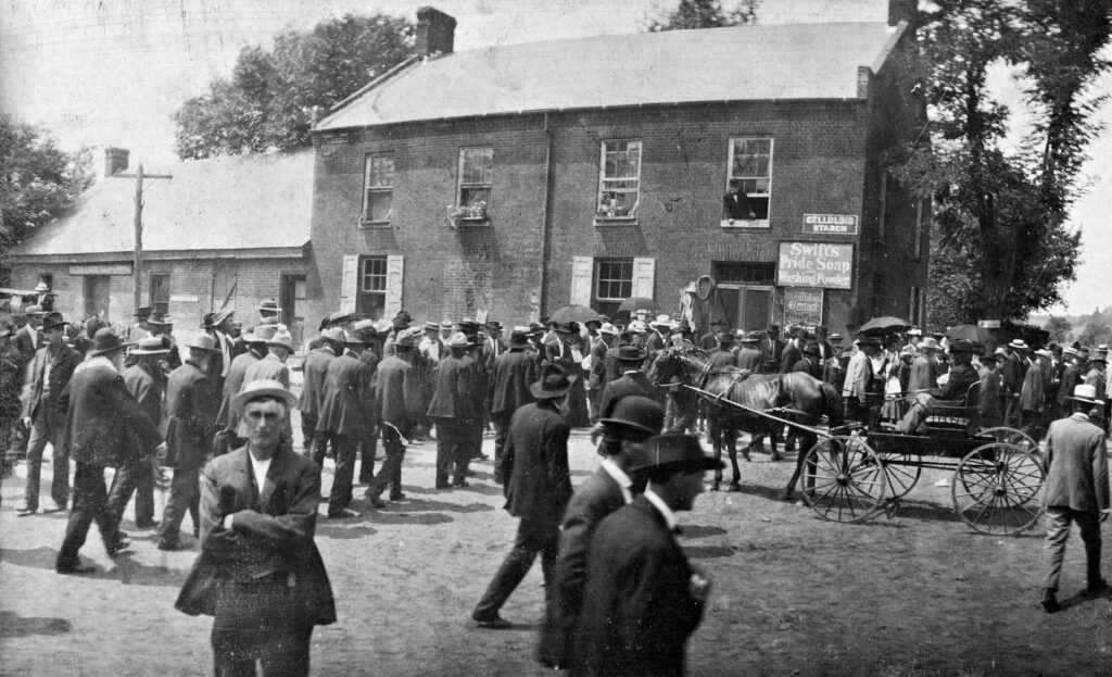 Prior to the Dorrier Building, an earlier structure stood on this site. It can be seen on the left in this panorama, taken in 1908 by local photographer William Burgess during the Reunion of Confederate Veterans. The photo was shot from the intersection of Valley and Main, looking up West Main Street.