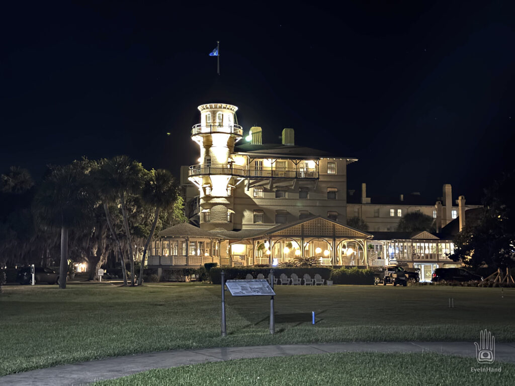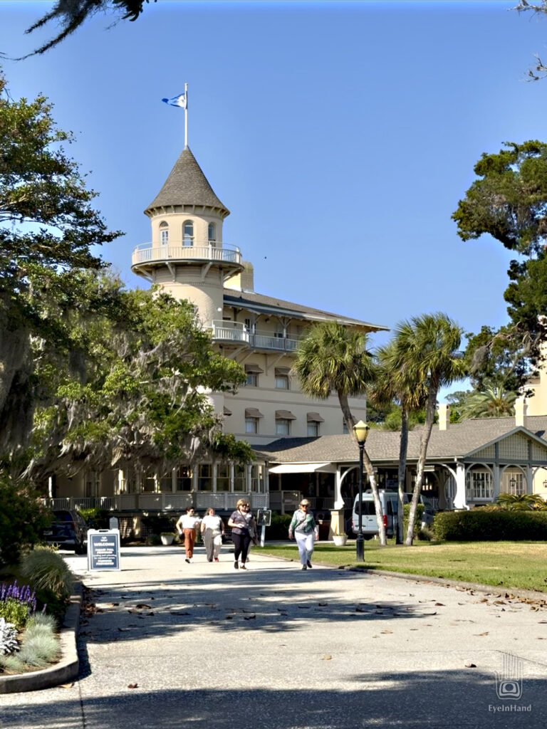 The original Clubhouse and most of the mansions are still here, and well maintained. I ride among “The Cottages”, some of which are now gift shops and museums, some for rent. Then around the Jekyll Island Clubhouse, which now operates successfully as a high-end resort. At least a dozen weddings are underway on wide manicured lawns under big white tents. More spill out of cottages into their gardens like flocks of pastel chickens around fancy coops.