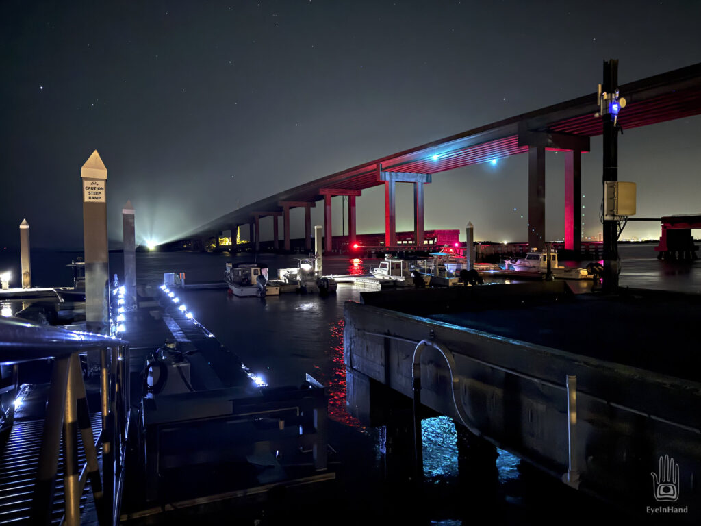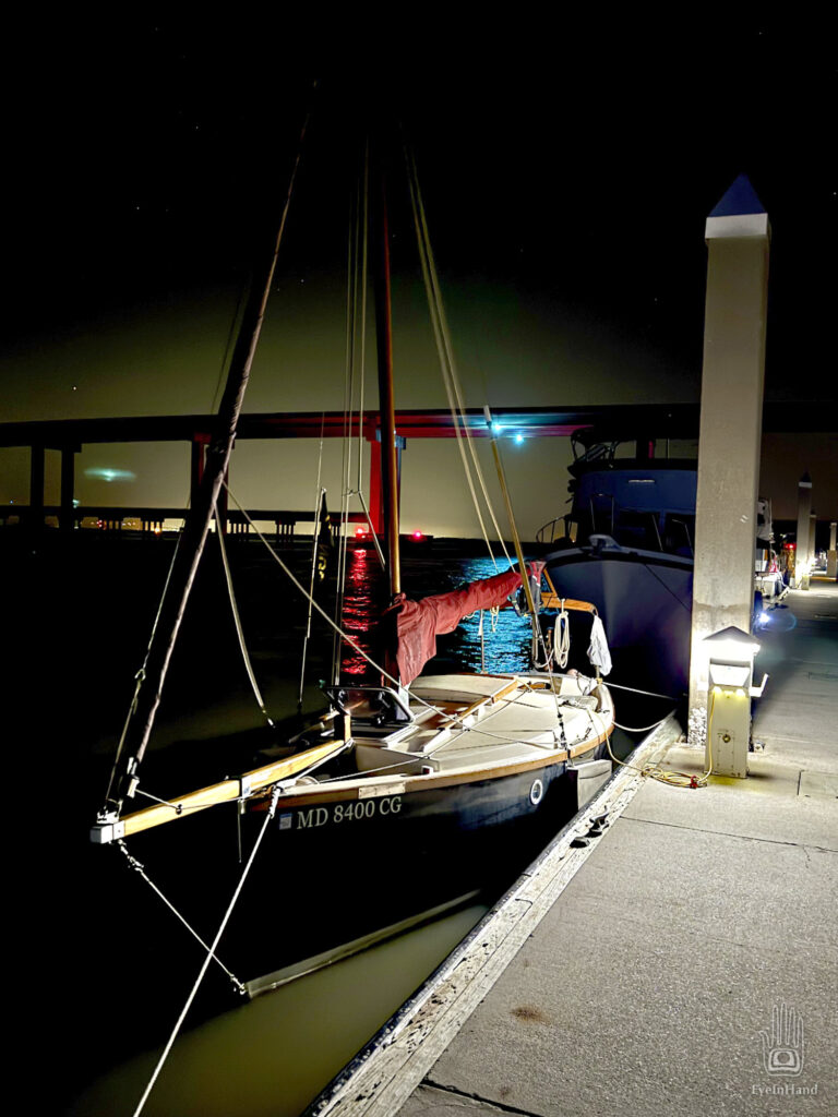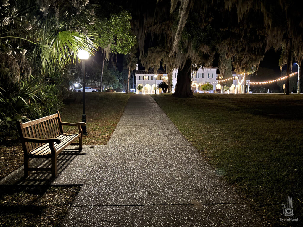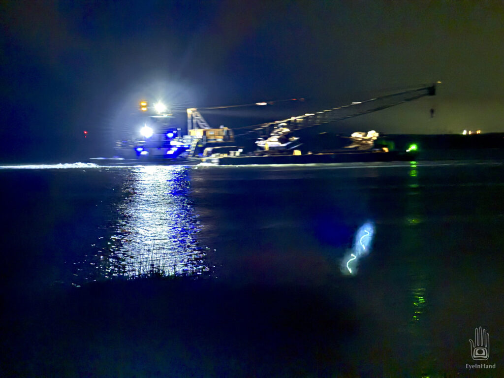I dodge crews in motorized carts collecting chairs and pulling down tents, and stop on the bluff to watch a tug pushing a barge up the river. The spotlight slashes over the marsh like an electric saber. When it strikes beards of Spanish Moss they glow incandescent. The “Cajun Radar” from Doug’s stories of the Gulf.