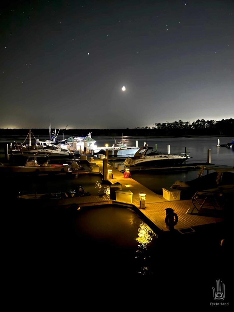 Our little marina is the only public water access on an otherwise private island. There’s a tall observation tower with 360 degree views over the marshes, laundry, and showers. We make use of them all. There’s also a fleet of golf carts available to mariners, which are needed to get to the shopping area miles away at the north end of the island. We decide there’s enough time to take one and get supplies before dinner. I ask Doug if he wants to drive, to which he replies with uncharacteristic enthusiasm.
