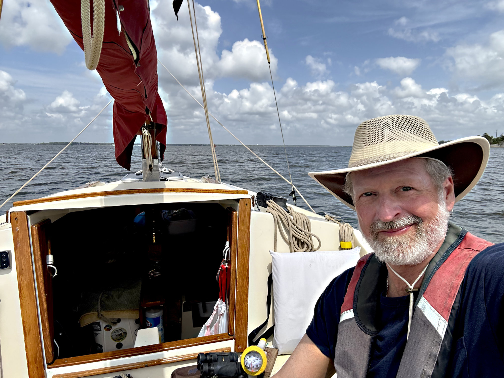The ampule of sacred cow’s milk in hand, we head back to the harbor and prepare the ship to push north. We drift out on the last of the Amelia River, saluted by train whistles from the pulp mill on the north end – freight cars and conveyors and mountains of sawdust and ships listing with cellulose. A group of boating tourists motors by, lined up like ducks in a row. We’ve seen these all over Florida – little paddle boat size contraptions big enough for two. Big outboards on each one that weigh more than the boat, but a governor on the motor limits them to jogging speed. All hat and no cattle. In St. Mary’s Inlet, we catch a glimpse of Fort Clinch to the east on the tip of Amelia, sunbathers on the beach, and the wide Atlantic beyond.