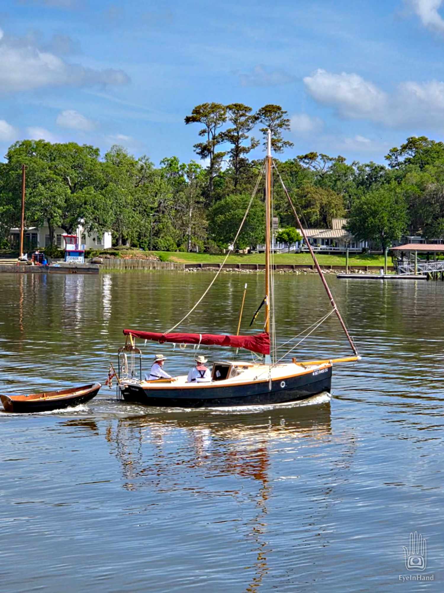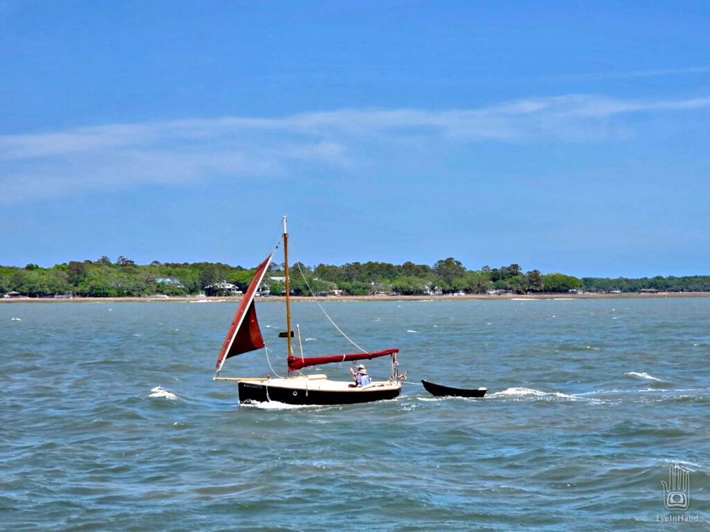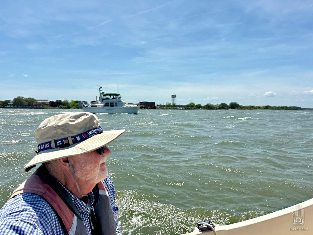 At least we aren’t beating INTO the wind. With the main furled, the jib flying, and help from the motor against the current, if feels like we’re galloping along with a herd of horses. White caps are everywhere, waves rolling, but they’re going the same direction we are. A trawler we’ve seen before runs alongside us, snaps a photo and sends it to Doug, with another taken when they passed us back in Georgia.