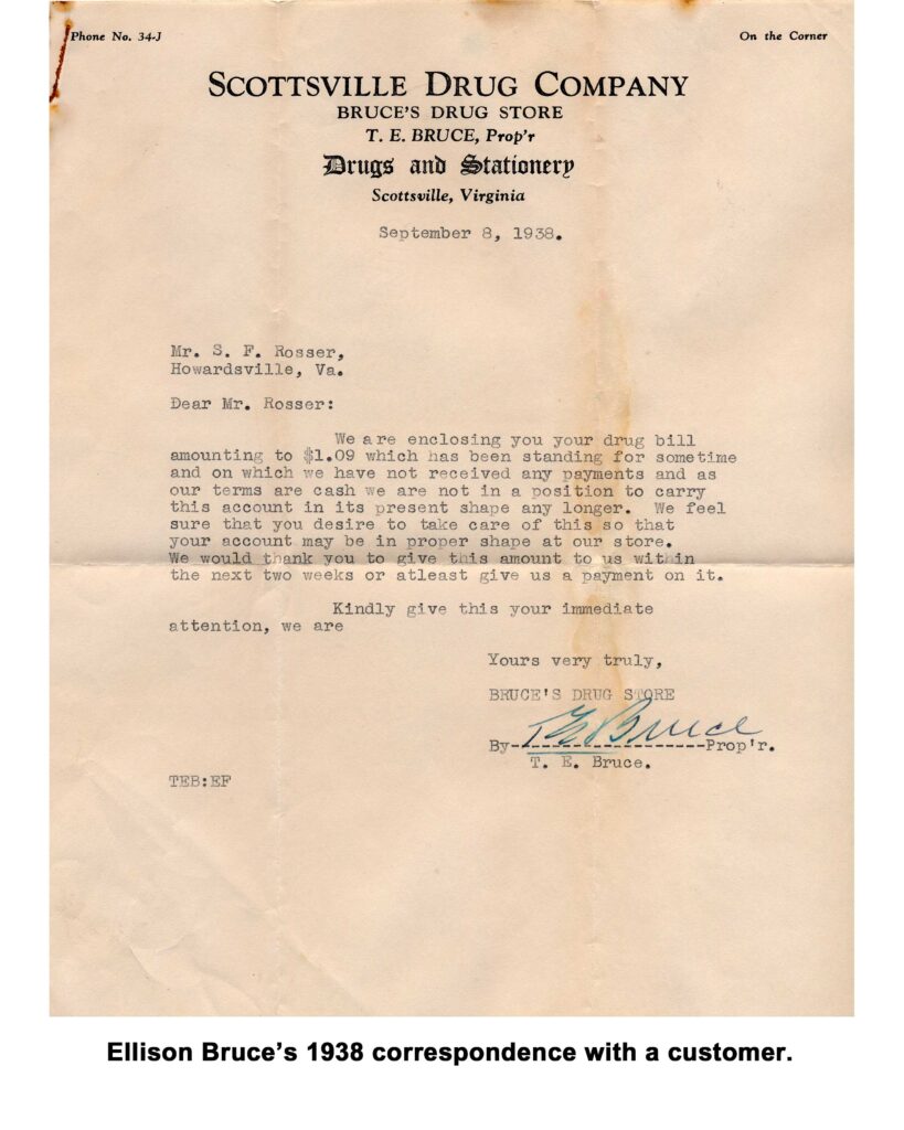 Bruce’s Drug Store began on November 1, 1908, under the name of Scottsville Drug Company. Dr. Luther R. Stinson and Dr. Benjamin L. Dillard, practicing physicians in Scottsville, maintained a small medicine shop in the town’s old apothecary shop on Valley Street (now 510 Valley Street). Finding it inconvenient to keep their shop open as much as the public demanded, the two doctors advertised for a full-time pharmacist in a Richmond newspaper. Thomas Ellison Bruce was working as a pharmacist in Newport News and answered their ad. Ellison and the two doctors formed a partnership in a pharmacy business called the Scottsville Drug Company. In the 1908 photo above, Ellison is shown standing behind the pharmacy counter of this drug store. The medicine bottles behind him held the medicinal supplies Ellison used to fill prescriptions.