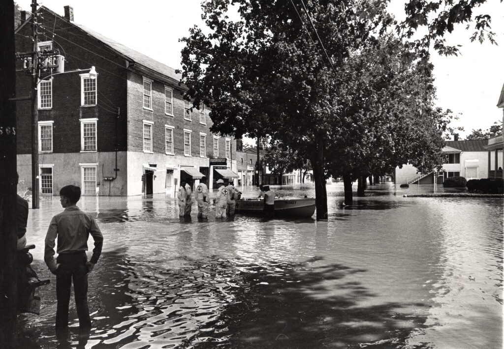 Ellison Bruce operated Bruce’s Drug Store until his death in November 1947. His son, Thomas Ellison Bruce, Jr., took over management of the drug store after his father’s death. Although educated as an accountant, Tom, Jr., went back to school in pursuit of a pharmacy degree at the Medical College of Virginia. He completely remodeled the drug store in 1953, installing new fixtures and air conditioning. In 1969, Hurricane Camille flooded Bruce’s Drug Store with 8.5 feet of water and James River mud, destroying its interior. Tom again remodeled the drug store and reopened in 1970. Two years later in June 1972, Tropical Storm Agnes flooded Bruce’s Drug Store with 12 feet of water. Again Tom remodeled and reopened his drug store.