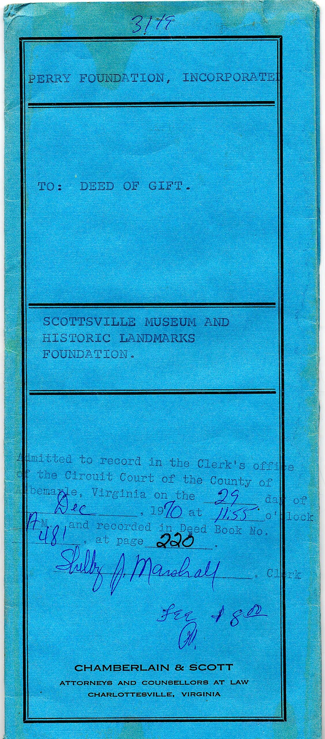 Another party, reported to be an Albemarle County contractor, was interested in the building and was supposed to have been near closing on the property when the Perry Foundation was contacted by Miss Moore on behalf of the museum committee.