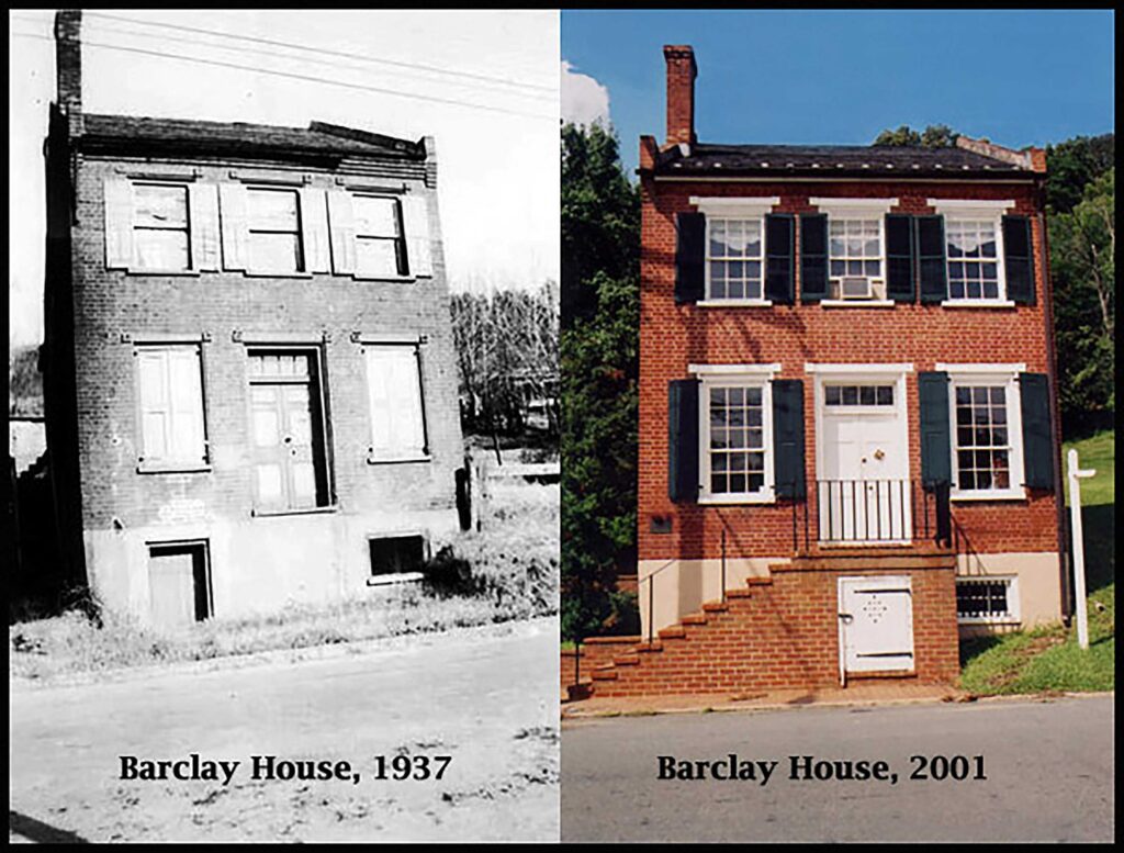 Shown below are photos to compare how the Barclay House looked in 1937 and how it looked in 2001. The 1937 photo is part of the Historical Inventory Report by R.E. Hannum for the Works Progress Administration of Virginia; Record No. VHIR/02/0282 applies at the Library of Virginia, Richmond, Virginia.