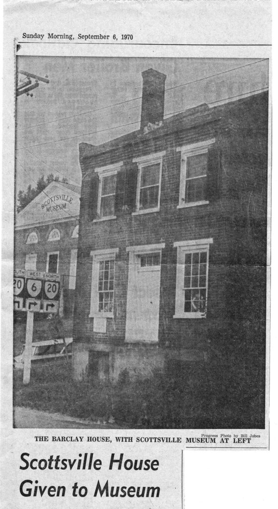 To learn more about how ownership of the Barclay House was passed to Scottsville Museum in 1970 by the Perry Foundation, please read the following article that appeared in the Daily Progress on September 06, 1970: